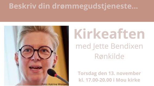 Derfor inviterer vi torsdag den 13. november kl. 17.00-20.00 til ”kirkeaften” med Jette Bendixen Rønkilde i Mou kirke.